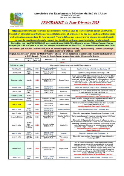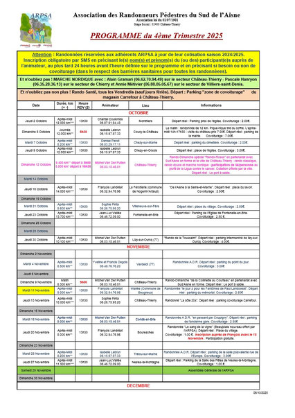 La randonnée du jeudi 12 juin 2025 au départ de Coucy-Le-Château et initialement programmée par Michel est annulée.